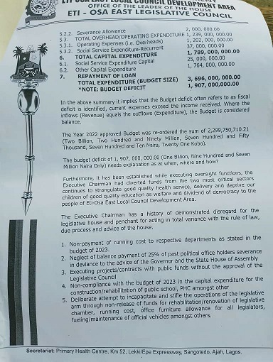 Among the allegations were failure to pay running costs to various departments of the council based on the 2023 Budget; neglecting balance payments to past political office holders against governmental advice; Unauthorised project execution and contract awards without legislative approval; Non-adherence to the 2023 budget for school and Primary Health Care construction/renovation; and failure to comply with legislative requests for income and expenditure records.