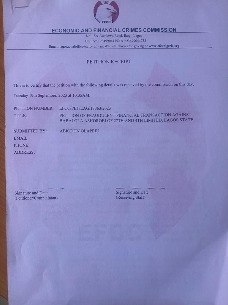 This scandal has sent shockwaves through the community, as Babalola Ashorobi, known for his social prominence and political connections, is suspected of orchestrating a fraudulent scheme that defrauded Mr. Abiodun Olapeju of a staggering $523,327.57 US Dollars through his company, 27th & 4th Limited.